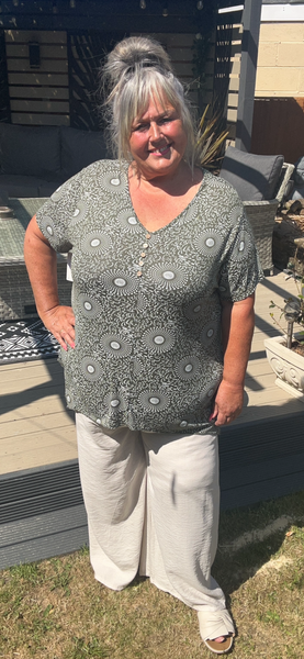 Lightweight casual easywear top with V neck & faux wooden buttons.