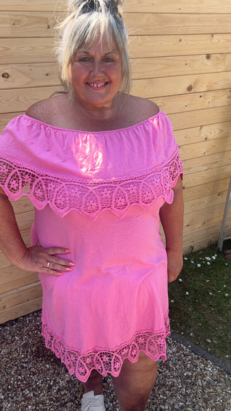 Bridget Dress - Simple Summer dress with Lace frill and hemline wear on or off shoulder Bardot Style. Lightweight making it perfect for Summer days and for your luggage allowance try teaming with a denim jacket and trainers.