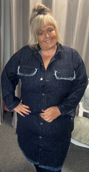 Dark wash longline denim Shacket / Dress.. Collared shacket with silver buttons, side pockets, breast pockets with fashionable raw edge complimenting the hemline. Can also be worn as a dress or add a top and wear open.