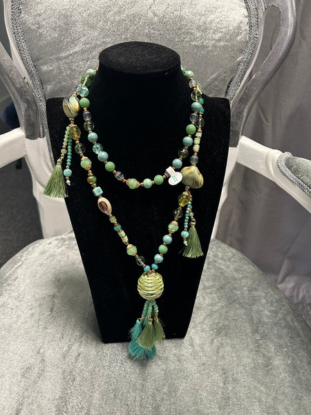 Green /Aqua multi shell, bead, wicker ball and tassels necklace absolutely fab!