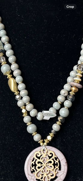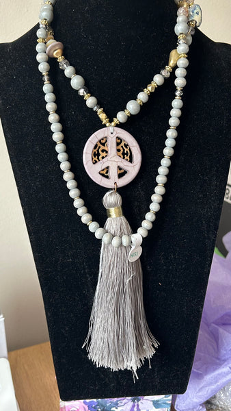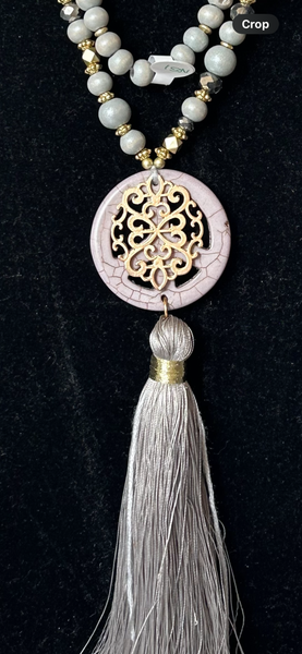 Long necklace where Less is More! Grey and gold beaded with a Peace style disc which has a gold coloured charm detail and long silver grey tassel .. Total length 25”